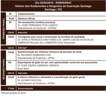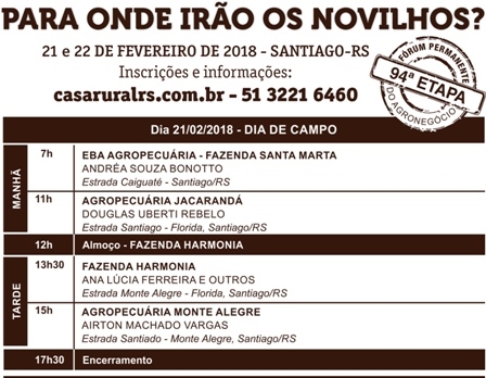 Nos dias 21 e 22 de fevereiro acontecerá a 94ª Etapa do Fórum Permanente do Agronegócio, um evento realizado pelo SENAR – RS com o promoção da Casa Rural, FARSUL e apoio do Sindicato Rural de Santiago, Unistalda e Capão do Cipó.