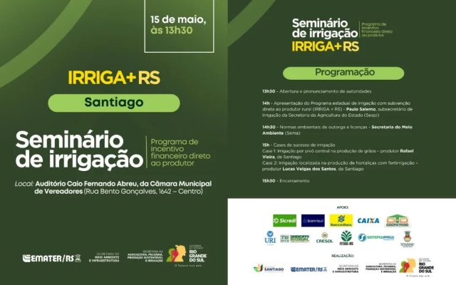 Convite Irriga+RS – Seminário de Irrigação Data:15/05, às 13:30 Local: Auditório Caio Fernando Abreu, da Câmara Municipal de Vereadores de Santiago Participe!!!