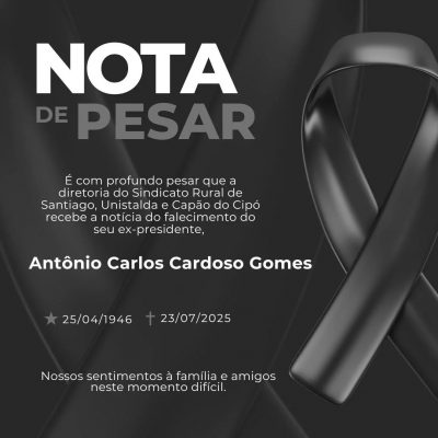 É com profundo pesar que a diretoria do Sindicato Rural de Santiago, Unistalda e Capão do Cipó recebe a notícia do falecimento do seu ex-presidente, Antônio Carlos Cardoso Gomes. Nossos sentimentos à família e amigos neste momento difícil.