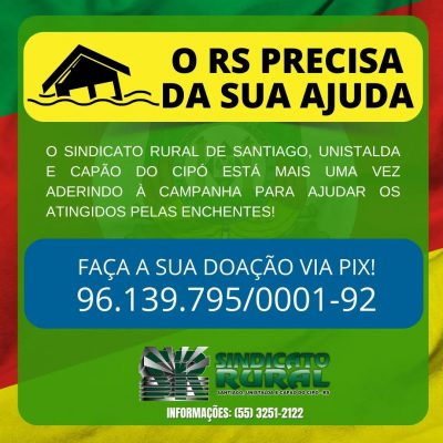 O Sindicato Rural de Santiago, Unistalda e Capão do Cipó está mais uma vez aderindo a campanha para ajudar os atingidos pelas enchentes!