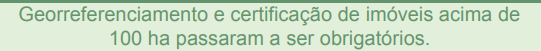 Desde o dia 20 de novembro de 2016, os imóveis rurais com mais de 100 hectares devem obrigatoriamente ser georreferenciados e certificados em caso de alterações no registro imobiliário, a exemplo de compra e venda, desmembramento, remembramento, sucessão, partilha ou mudança de titularidade. Antes desta data, a exigência era para georreferenciar e certificar imóveis com área igual ou superior a 250 hectares.