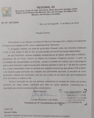 Na manhã de hoje (sexta-feira, 15/03), três presidentes de Sindicatos Rurais do RS entregaram Ofício aos secretários de estado Giovani Feltes (agricultura) e Ernani Polo (desenvolvimento econômico) demandando que o aumento de tributos planejado pelo governo do estado seja suspenso imediatamente. Está previsto aumento de impostos estaduais nos defensivos agrícolas e na cesta básica a partir de 1º de abril. O Ofício, entregue em evento realizado na Casa Coopatrigo em São Luiz Gonzaga, foi assinado pela presidente Lourdes Margareth Costa Beber, Presidente da Regional 12, que representa os produtores rurais de doze municípios da região das Missões. Momentos antes do ato de entrega, o presidente Lauro Sagrilo, do Sindicato Rural de Santiago, Unistalda e Capão do Cipó, manifestou-se de público dizendo que a totalidade dos produtores rurais era contrária ao aumento da tributação, e que o governo Eduardo Leite deveria apoiar os produtores nesse momento difícil do setor, uma vez que o estado passou por duas estiagens consecutivas, e sofre com a queda acentuada das cotações dos grãos e do kg do boi gordo. Também participaram da entrega do Ofício, o presidente do Sindicato Rural de Santo Antônio das Missões, Luiz Antônio Guimarães do Prado, e o presidente da Rural Jovem Santiago e 1º tesoureiro do Sindicato Rural de Santiago, Henrique Nascimento.